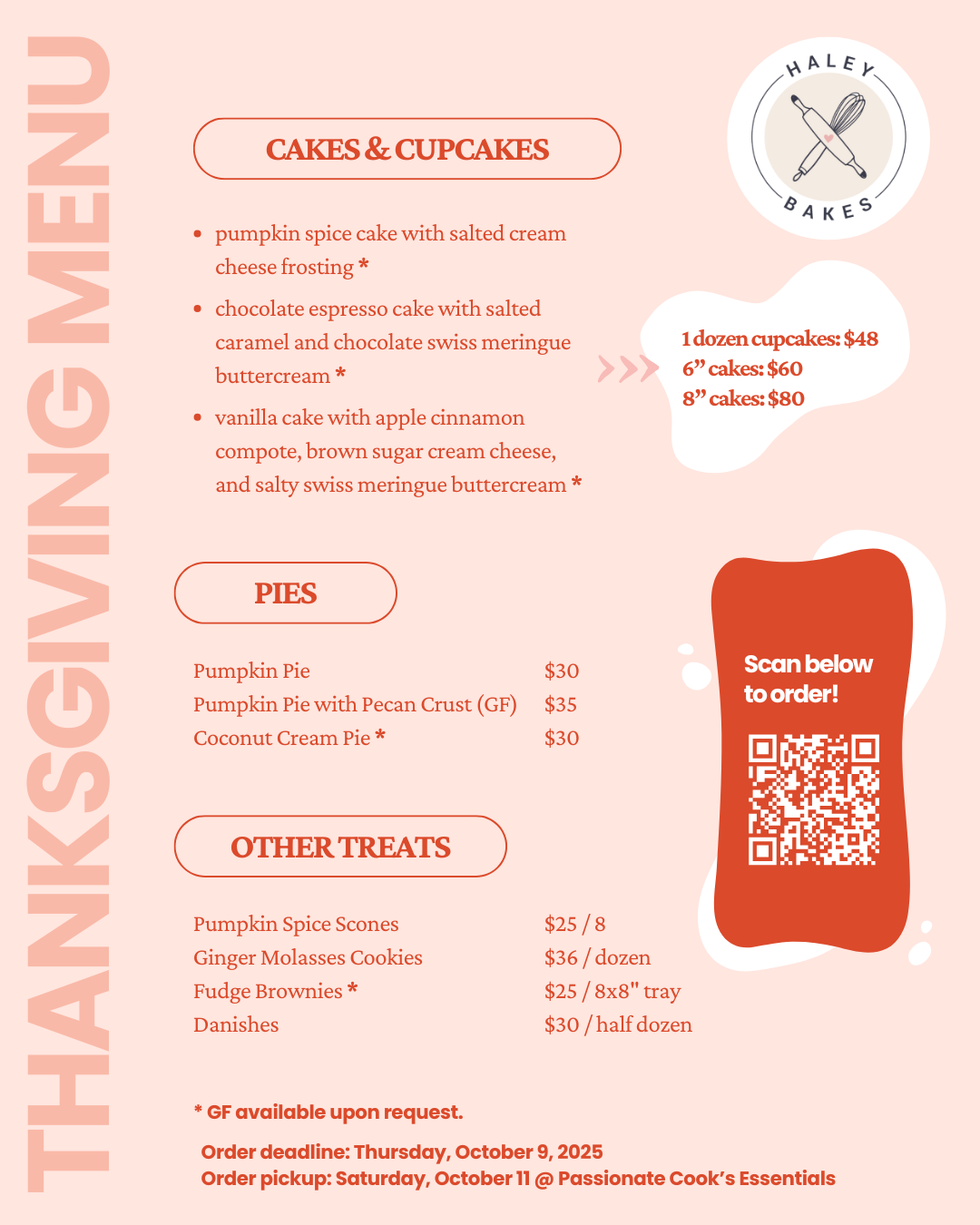 You may know Haley as the instructor that teaches our baking classes at the Passionate Cook. For Thanksgiving we are offering pick up at our store for orders placed directly with her website.